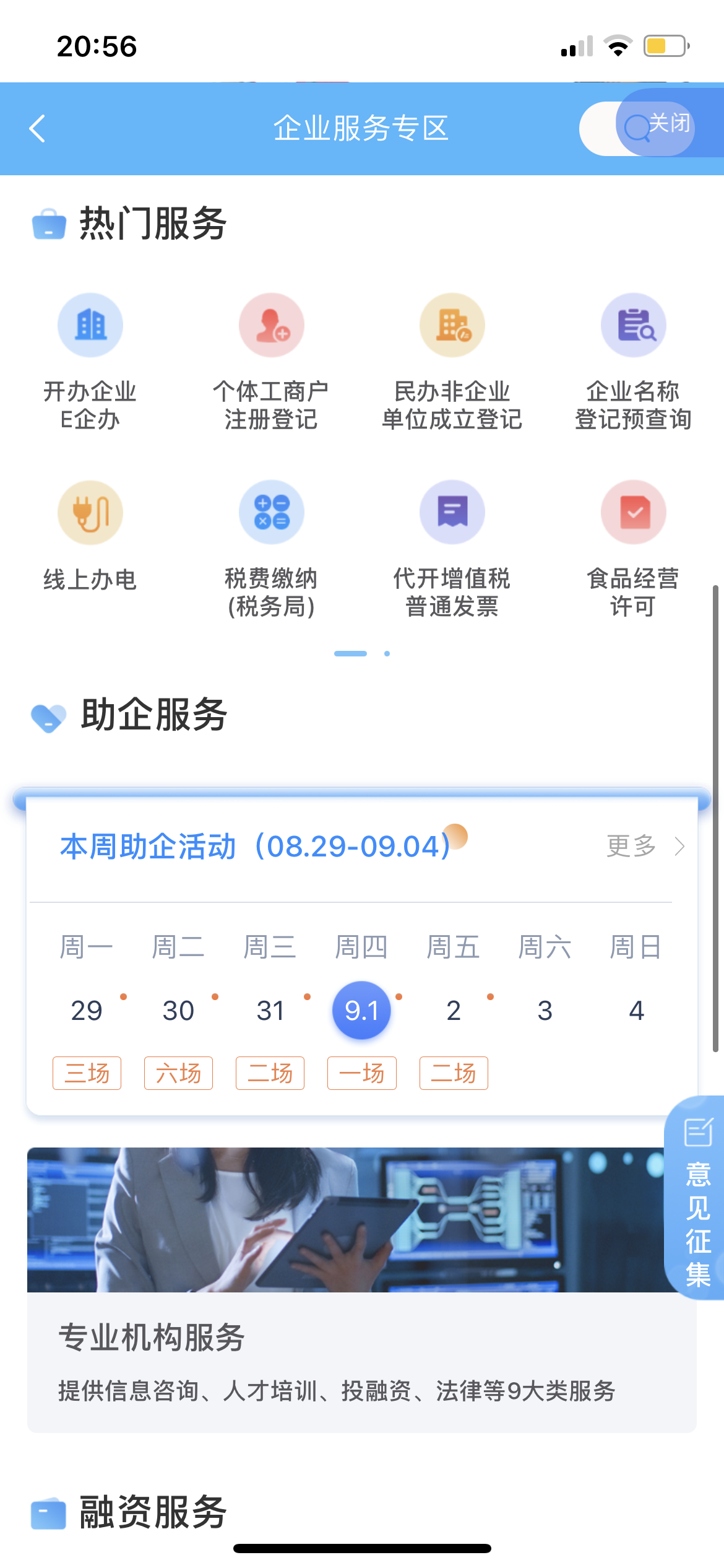 “热门服务”板块,整合了企业常用的高频服务事项,集中提供我市在开办企业、个体工商户注册登记、税费缴纳、代开增值税普通发票、线上办电、专利查询、食品经营许可、中小企业公共服务等方面的政务服务。