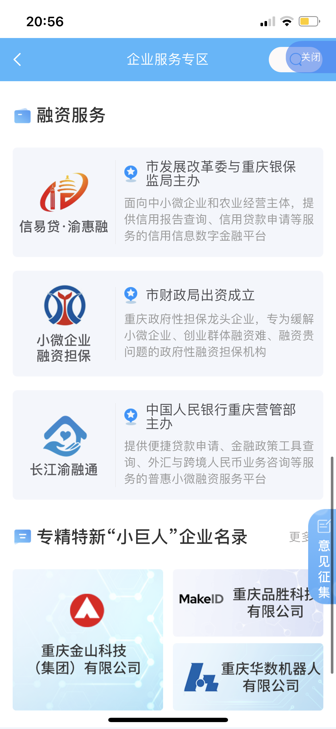 记者打开重庆市政府APP,在“渝快办”移动端主界面看到“企业服务专区”板块,点击进入后即可看到该专区涵盖的“特色服务”“政策服务”“热门服务”“助企服务”“融资服务”“专精特新‘小巨人’企业名录”等六大板块服务内容。