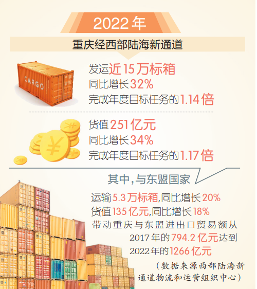 3月4日,重庆日报记者从西部陆海新通道运营组织中心获悉,近年来,通道保持高质量增长态势,重庆经西部陆海新通道去年发运近15万标箱,同比增长超三成。今年1—2月,重庆经西部陆海新通道运输2.1万标箱,同比增长46%,货值36.56亿元,同比增长43%。