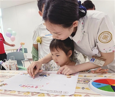 重庆市中医骨科医院小儿骨科护士陪伴患儿绘画。受访单位供图