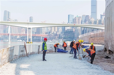 施工单位现场负责人介绍,目前项目进展顺利,步道结构工程已完成总量的80%,绿化工程完成总量的75%。其中,大溪沟码头至洪崖洞两江游码头剩余收尾工作也已全面展开,为后续全线贯通奠定了坚实基础。